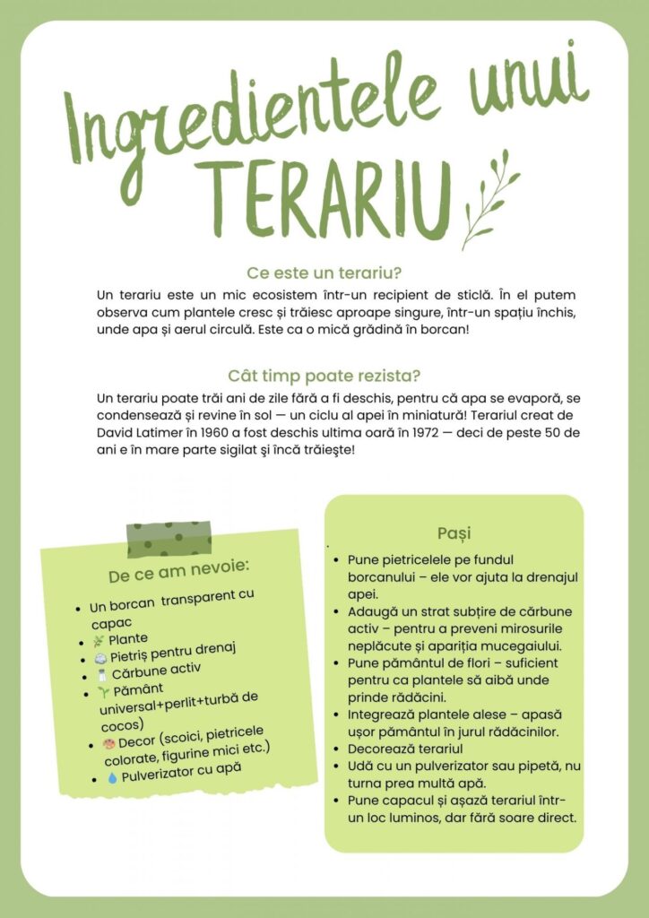 Un element central va fi „Spitalul plantelor”, unde fiecare copil îngrijește o plantă „pacient”, observând nevoile acesteia, documentând transformările și învățând să aibă grijă de ea în timp.